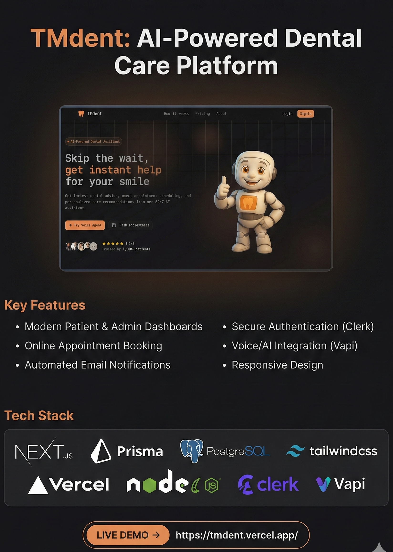 TMdent is a modern dental appointment platform built with Next.js and PostgreSQL, featuring secure Clerk authentication, automated Nodemailer confirmations and AI voice integration via Vapi. It offers dedicated patient and admin dashboards with a polished, responsive UI powered by TailwindCSS.